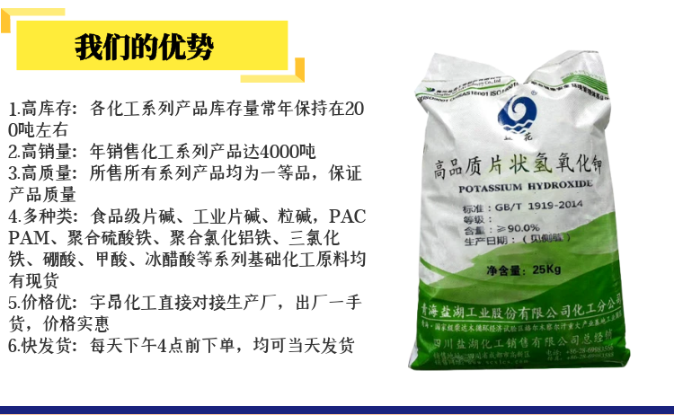 產(chǎn)品名稱:片狀氫氧化鉀 水溶肥 苛性鉀 90% 95% 青海鹽湖 宇昂化工 25KG/袋