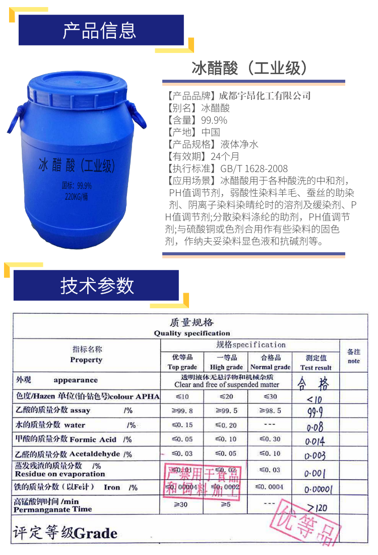 產(chǎn)品名稱:冰醋酸 食品級醋酸 揚子牌 冰乙酸 酸度調節(jié) 宇昂化工 含量99.9%