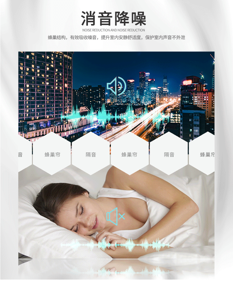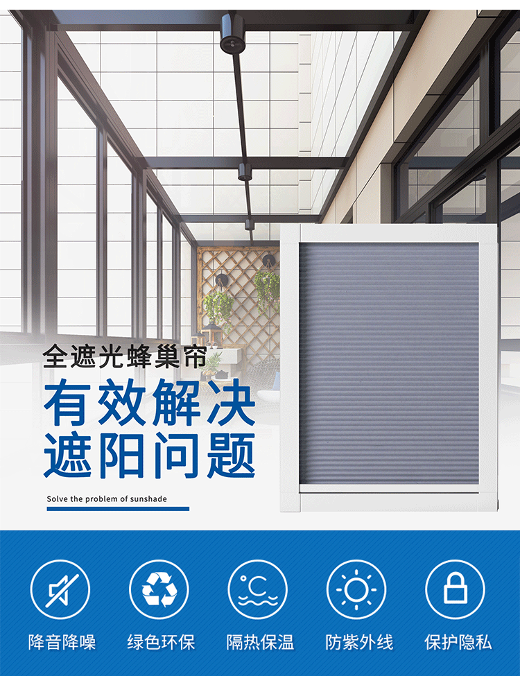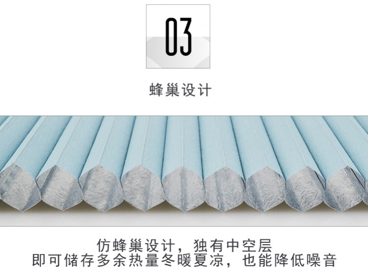 蜂巢簾又名風琴簾,靈感來自于建筑——蜂巢的設計,蜂窩結構,使空氣存儲于中空層,令室內(nèi)保持恒溫,隔熱保暖。其防紫外線和隔熱功能有效保護家居用品,防靜電處理,洗滌容易。簾布采用進口無紡布與鋁箔膜有機結合,面料中空,隔熱保暖。遮陽簾緊貼玻璃,面料不下垂。裝上它后,面料有雙層全遮光與單層半遮光兩種選擇,雙層全遮光面料隔熱遮陽效果無與倫比,單層半遮光面料透光效果好看。