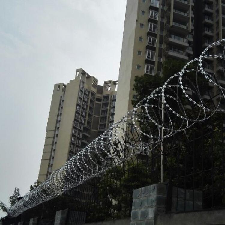 刀片刺繩防護網刀片刺繩防護網是一種新型防護網。該產品具有嚇阻效果好·美觀·施工便利·經濟實用等優(yōu)異特點。刀片刺繩防護網主要用于園林公寓·機關單位·監(jiān)獄·哨所·邊防等的圈禁防護。刀片刺繩防護網由銳利尖角鍍鋅鋼板或不銹鋼薄板做刀片,高張力鋼絲做芯線組合而成的阻絕器材。由于刀片刺繩防護網造形獨特不易觸摸,因而能達到極好的防護隔離效果。直線形刀片刺網由刀片型直線刺網交叉焊接成型,可用于防盜窗、高速護欄、隔離柵。施工迅速、效果顯著。
