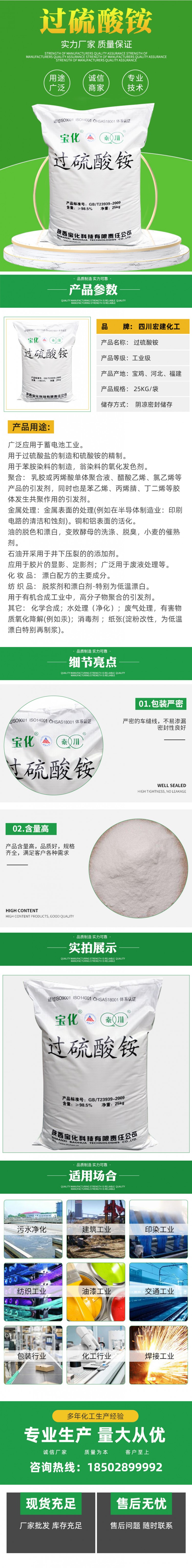 化學(xué)工業(yè)用作制造過(guò)硫酸鹽和雙氧水的原料,有機(jī)高分子聚合時(shí)的助聚劑、氯乙烯單體聚合時(shí)的引發(fā)劑。油脂、肥皂業(yè)用作漂白劑。還用于金屬板蝕割時(shí)的腐蝕劑及石油工業(yè)采油等方面。食品級(jí)用作小麥改質(zhì)劑、啤酒酵母防霉劑。