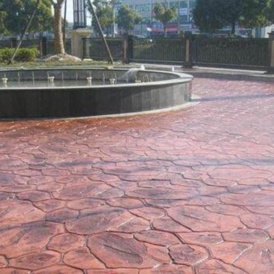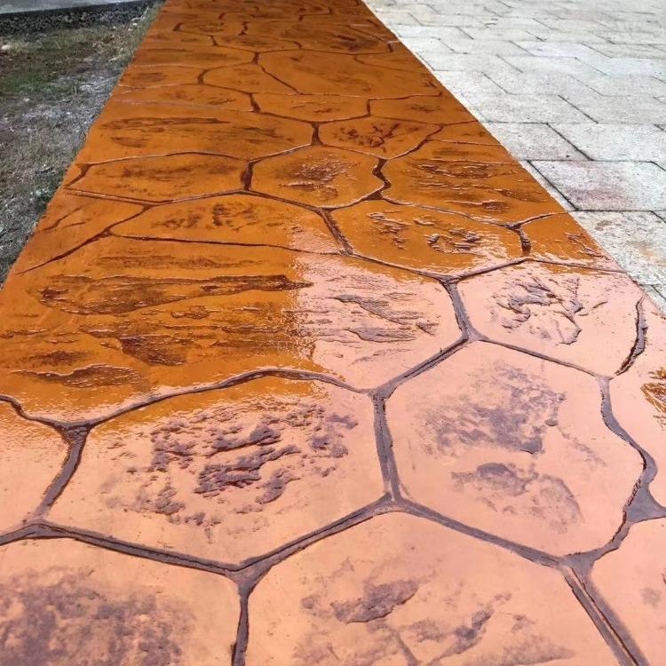 5、使用藝術(shù)地坪模具對地坪面層進行紋理處理。藝術(shù)地坪模具應配套使用,首先確定好紋理的分布方向,選好一塊模具放置的位置和角度,然后其它的模具依次緊貼一塊模具放置。彩色混凝土藝術(shù)地坪壓模采用壓模,壓模應由技術(shù)較好的人員進行作業(yè)以保證壓紋深度一致和模具放置的準確性。