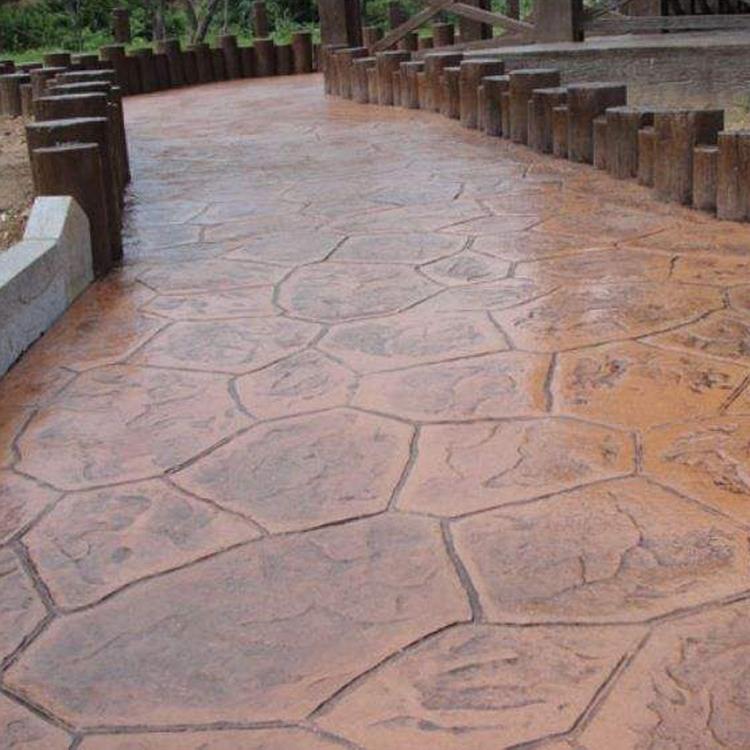 5、使用藝術(shù)地坪模具對地坪面層進(jìn)行紋理處理。藝術(shù)地坪模具應(yīng)配套使用,首先確定好紋理的分布方向,選好一塊模具放置的位置和角度,然后其它的模具依次緊貼一塊模具放置。彩色混凝土藝術(shù)地坪壓模采用壓模,壓模應(yīng)由技術(shù)較好的人員進(jìn)行作業(yè)以保證壓紋深度一致和模具放置的準(zhǔn)確性。