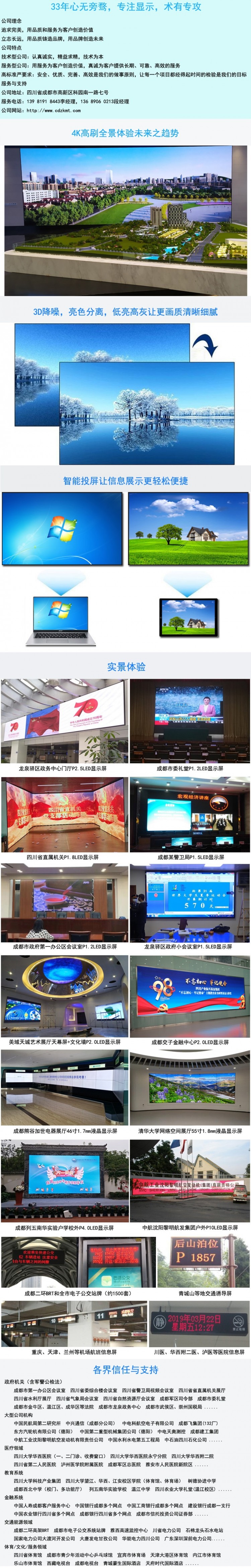 公司多年來面向是各行業(yè)的系統(tǒng)集成公司,為他們提供優(yōu)質(zhì)優(yōu)價(jià)的產(chǎn)品、工程和技術(shù)服務(wù)。如長(zhǎng)期向中國民航局第二研究所開發(fā)定制各大機(jī)場(chǎng)顯示屏系統(tǒng);青島海信集團(tuán)開發(fā)制造成都二環(huán)BRT、茶店子公交樞紐站、攀枝花公交系統(tǒng)顯示屏等;向系統(tǒng)集成公司開發(fā)定制成都公交系統(tǒng)智能站臺(tái)顯示屏、四川氣象系統(tǒng)顯示屏、環(huán)保系統(tǒng)(全國多省市)顯示屏等。我們的顯示屏產(chǎn)品多年來以優(yōu)異的品質(zhì)和口碑通過多種形式廣泛應(yīng)用到部隊(duì)、政府、企業(yè)、醫(yī)療、交通、電力、教育等單位的控制大廳、會(huì)議室、廳堂、服務(wù)窗口等場(chǎng)所。