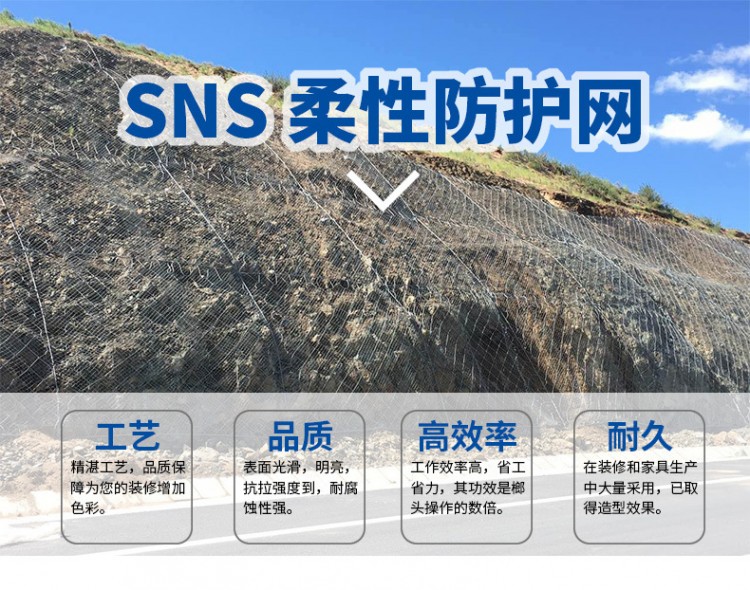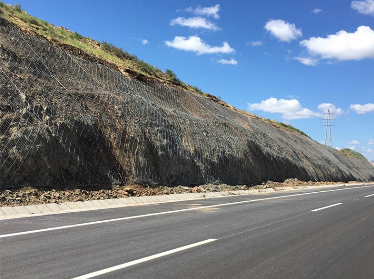 邊坡防護網有主動防護與被動防護,主動防護系統(tǒng)是以鋼絲繩網為主的各類柔性網覆蓋包裹在所需防護斜坡或巖石上,以限制坡面巖石土體的風化剝落或破壞以及為巖崩塌(加固作用),或將落石控制于一定范圍內運動(圍護作用)。被動防護是由鋼絲繩網、環(huán)形網、(需攔截小塊落石時附加一層鐵絲格柵)、固定系統(tǒng)(錨桿、拉錨繩、基座和支撐繩)減壓環(huán)和鋼柱四個主要部分構成。鋼柱和鋼絲繩網連接組合構成一個整體,對所防護的區(qū)域形成面防護,從而阻止崩塌巖石土體的下墜,起到邊坡防護作用。