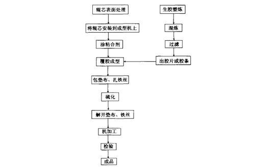 橡膠膠輥的成型過(guò)程與其他固體橡膠制品相類(lèi)似的是混煉膠的制備,即首先需用大功率開(kāi)煉機(jī)對(duì)某些生膠進(jìn)行塑煉,賦予生膠塑性,便于以后的成型加工然后將生膠或塑煉膠與各種配合劑放人密煉機(jī)中進(jìn)行均勻混合。因?yàn)槟z輥表面要求很高,膠料中不能混人任何雜質(zhì),否則會(huì)嚴(yán)重影響其使用性能,因此膠料混煉后必須進(jìn)行過(guò)濾,而后是壓片、壓延,即壓出薄厚均勻的膠片,以備下道成型工序使用,成型工序是膠輥生產(chǎn)中的一個(gè)重要環(huán)節(jié),其方法也多種多樣,本文將在后面著重介紹成型工序中的成型方法及特點(diǎn)一道工序是將已成型膠輥包上布、并用鐵絲扎緊,送人硫化罐硫化。硫化后還需車(chē)磨,以保證餃輥表面的光潔度和尺寸精度。橡膠餃輥的加工工藝流程如下: