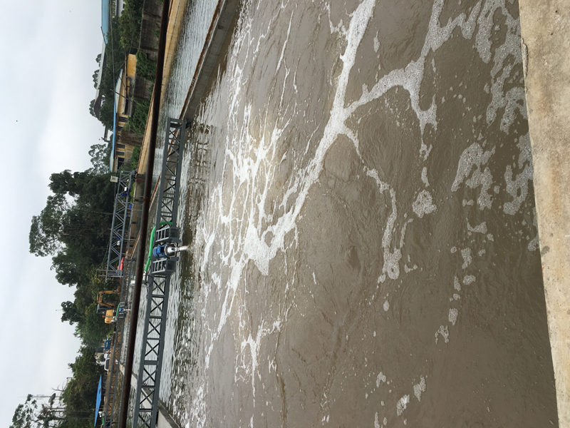 螺旋推流攪拌曝氣機(jī)葉輪高速旋轉(zhuǎn)時(shí)產(chǎn)生強(qiáng)大的軸向推力和徑向攪拌力,將吸入的空氣粉碎成細(xì)微氣泡,并且將汽水混合體強(qiáng)力注入水中,從而達(dá)到曝氣和推流攪拌混合的雙重作用,并且噴射流不會產(chǎn)生應(yīng)力和漩渦而引起的振動,螺旋推流攪拌曝氣機(jī)的葉片高速轉(zhuǎn)動時(shí)在葉輪前端形成數(shù)股強(qiáng)大剪切水流,這幾股水流將氣體剪切成細(xì)微氣泡而且切割形成若干的微氣泡直徑較均勻,葉輪旋轉(zhuǎn)的軸向推力將氣、水混合物強(qiáng)力注入水中產(chǎn)生二次切割,使氣泡的粒徑變俄更小,平均粒徑為1.5mm,汽水混合物在水中形成長度為8~45mm的氣、水混合擴(kuò)散柱,從而延長了氣水接觸時(shí)間,大大提高氧的利用率,其效果達(dá)到水的排放標(biāo)準(zhǔn)。