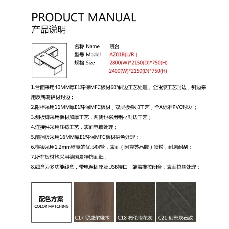 2、擋板:16MM厚E1環(huán)保MFC板材,雙層板疊加+拼色工藝處理。 3、橫梁:1.2MM壁厚優(yōu)質(zhì)鋼管,表面(阿克蘇品牌)噴粉,耐磨耐刮。 4、所有板材均采用德國夏特飾面紙。 5、封邊:全A標準PVC封邊,接縫處自然均勻,不透膠,無明顯裂痕。 6、走線:具有可開關的鍵盤托及完善的走線功能,配置插座掛槽、線孔等配件。 7、五金配件:采用出名品牌的優(yōu)等品。 ![]() ![]() ![]() ![]() ![]() ![]() ![]() ![]() 共0條 相關評論 |