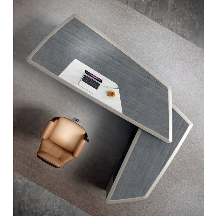 4、桌面加厚至4cm,中纖板基材,四周倒斜角處理,內(nèi)嵌銀絲梨木裝飾;封邊采用五底三面油漆封邊工藝;線槽位鑲嵌卡拉白色巖板;寫字位選用優(yōu)質(zhì)超纖皮革飾面;