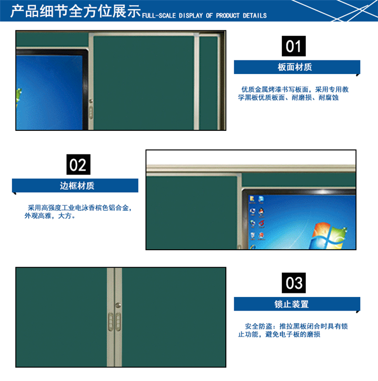 11、其他:配備自拆裝置,內(nèi)層的教學設(shè)備可直接拆裝維護,節(jié)省拆裝黑板的時間及費用,延緩使用壽命。