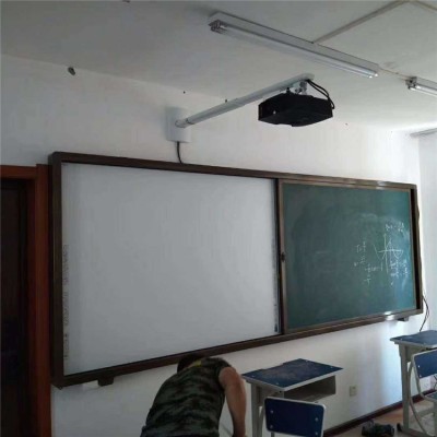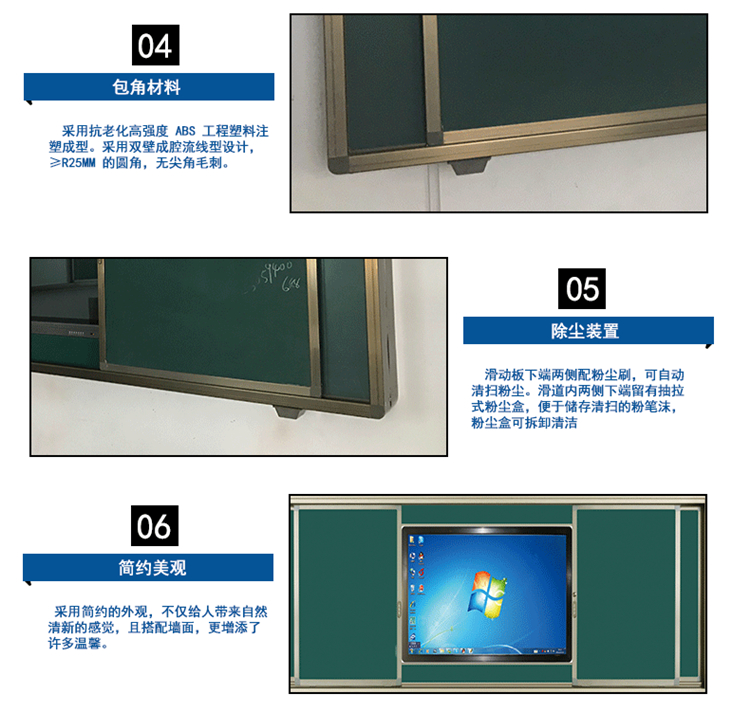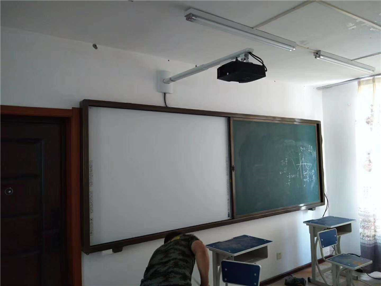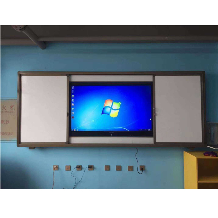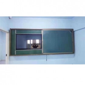 2、結(jié)構(gòu):左右推拉結(jié)構(gòu)(內(nèi)置軌道,外框和軌道一體化設(shè)計)。板面雙層設(shè)計,內(nèi)層為固定書寫板與教學設(shè)備并行,外層為滑動書寫板,使用教學設(shè)備時可將滑動板推到兩側(cè)側(cè)露出教學設(shè)備即可使用,不用時可將滑動板拉到前面完全遮擋教學設(shè)備并鎖定。黑板與教學設(shè)備之間完美鑲嵌,壁掛設(shè)計。