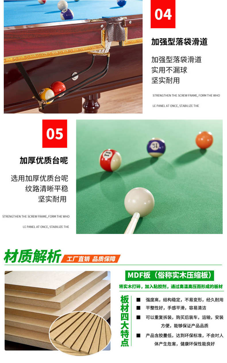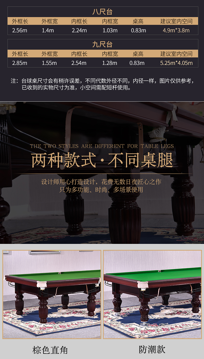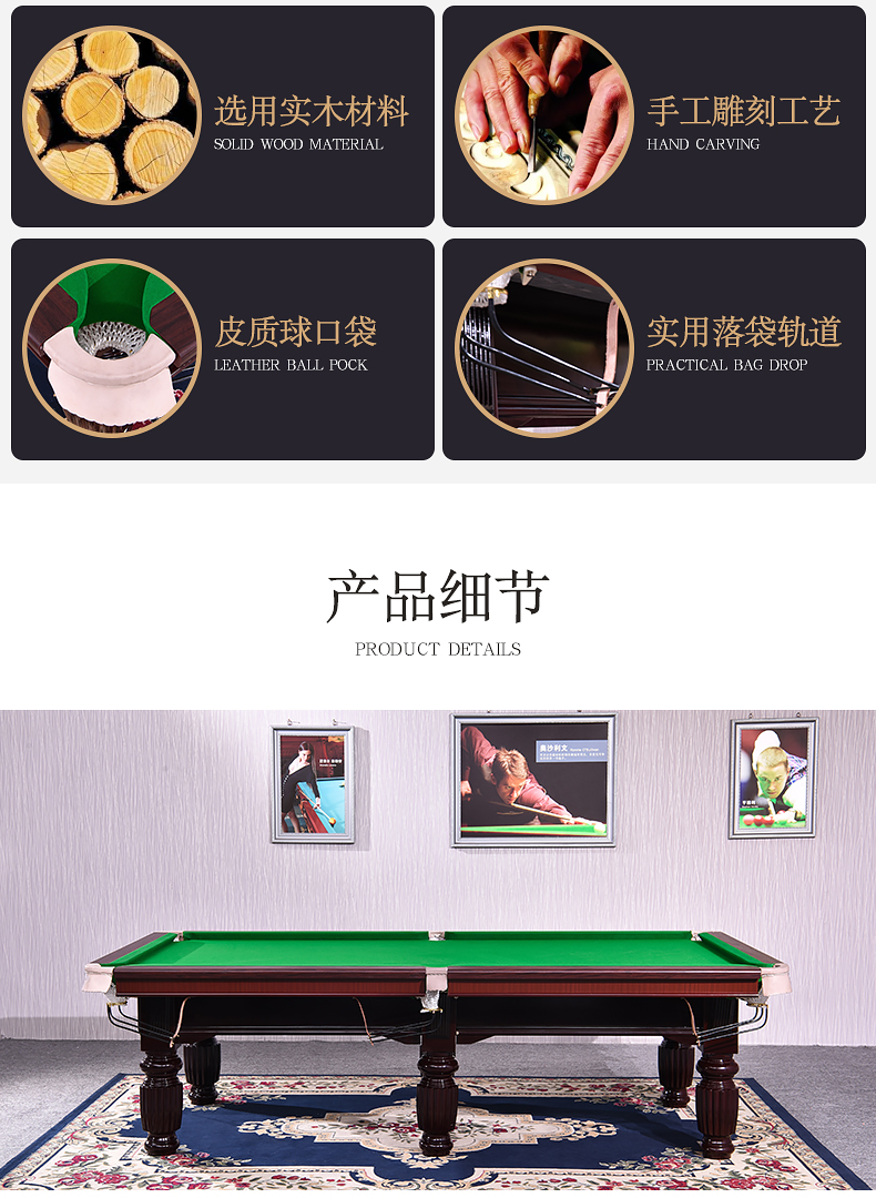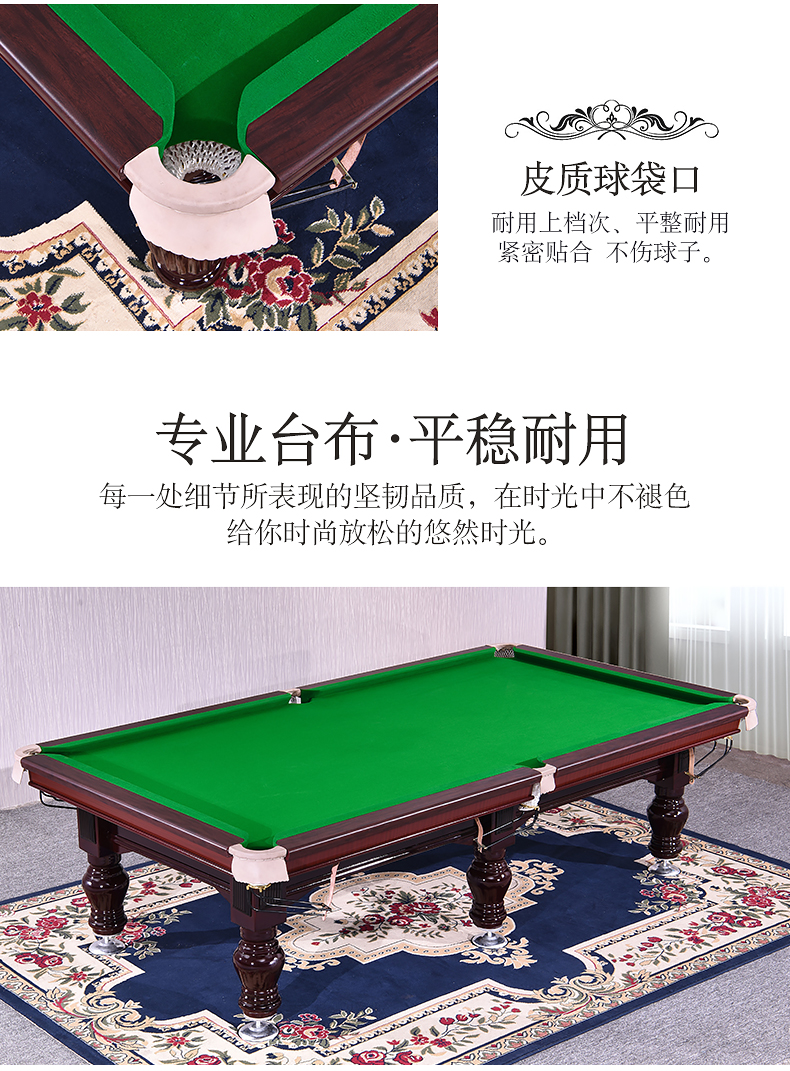 A級(jí)大理石石板,進(jìn)口防火板,實(shí)木扶手。尺寸:2.83*1.55*0.85米,配置:臺(tái)尼一張,美式球1盒,球桿4支,架桿1支,巧粉12粒,手套2個(gè),皮頭10粒,膠水1粒,桿架1個(gè),三角框1個(gè)