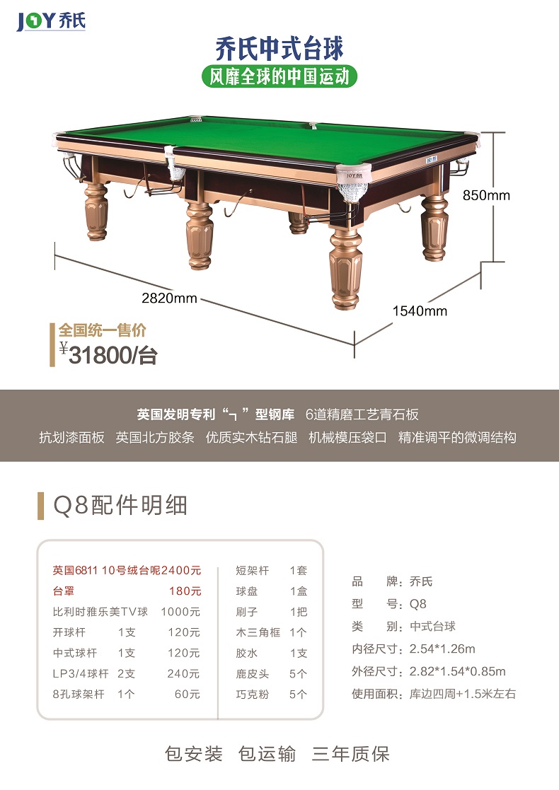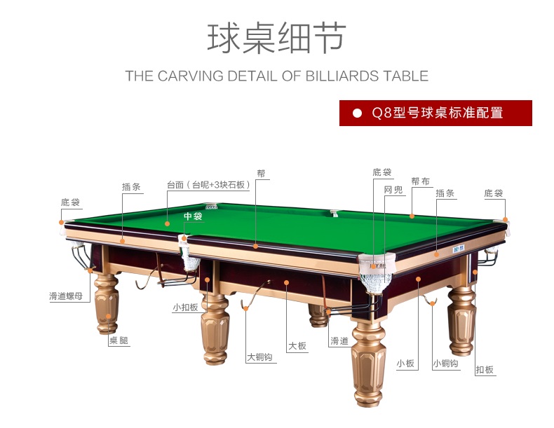 A級大理石石板,進口防火板,實木扶手。尺寸:2.83*1.55*0.85米,配置:臺尼一張,美式球1盒,球桿4支,架桿1支,巧粉12粒,手套2個,皮頭10粒,膠水1粒,桿架1個,三角框1個