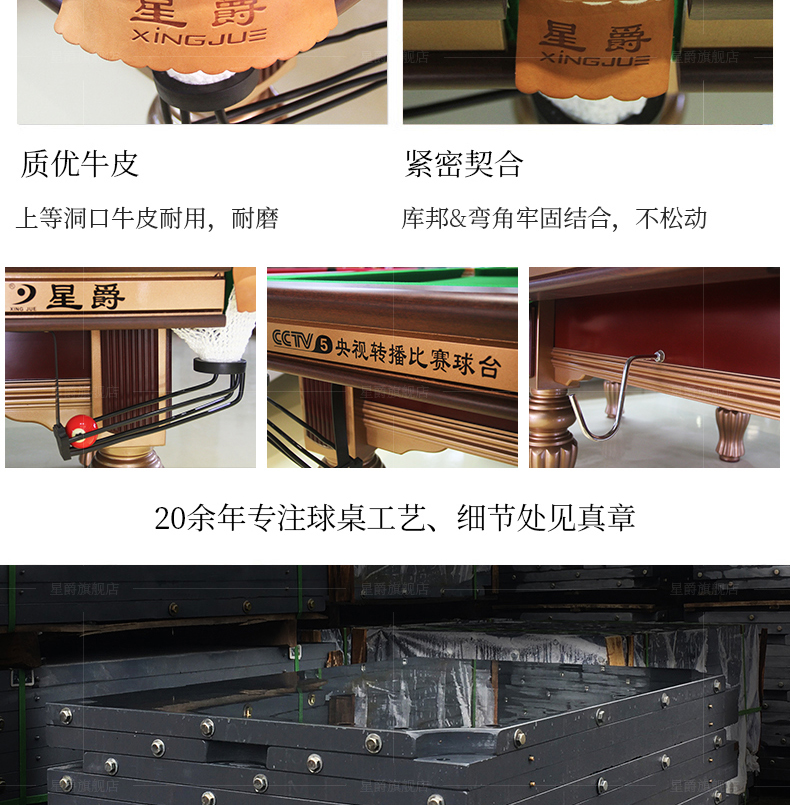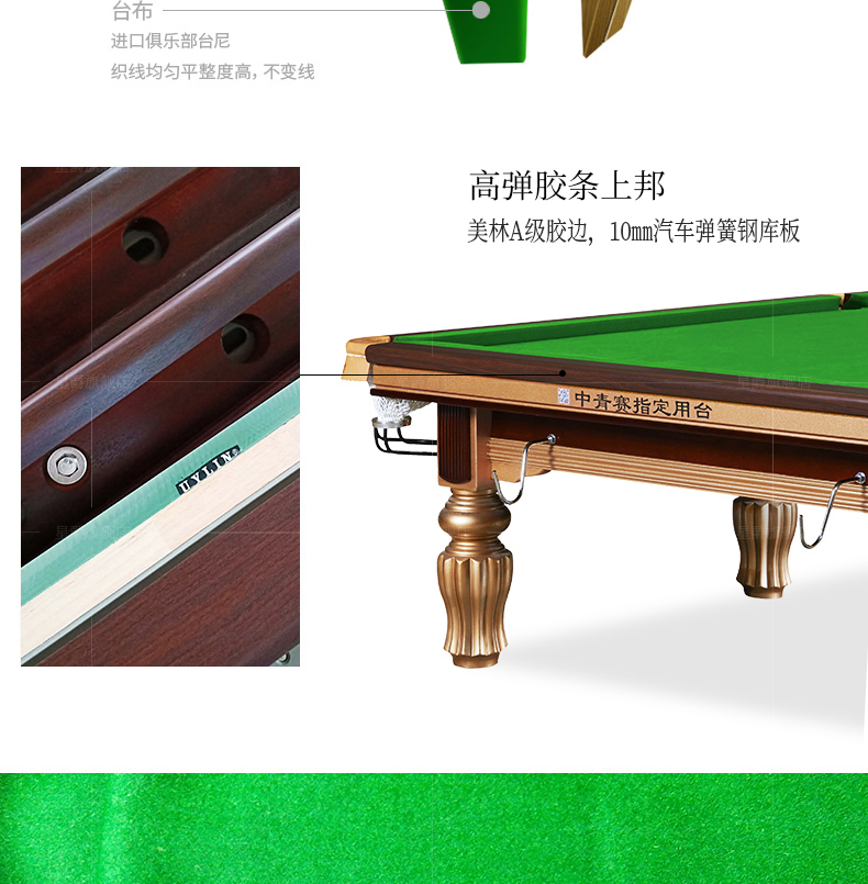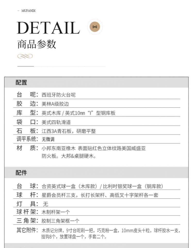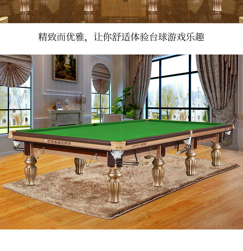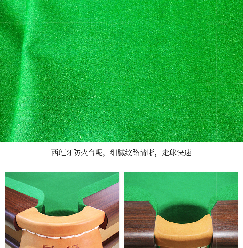 A級青石板,美國進口防火板,實木扶手。尺寸:2.03*3.83*0.85米,配置:臺尼一張,英式球1盒,球桿4支,架桿4支,長打長架,巧粉12粒,手套2個,皮頭10粒,膠水1粒,桿架1個,三角框1個