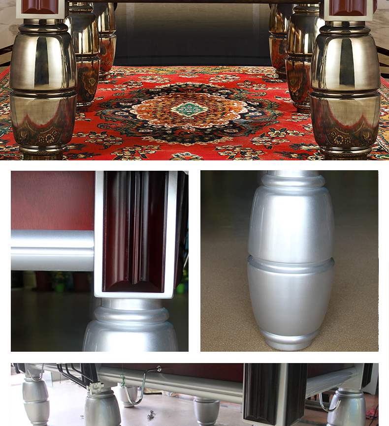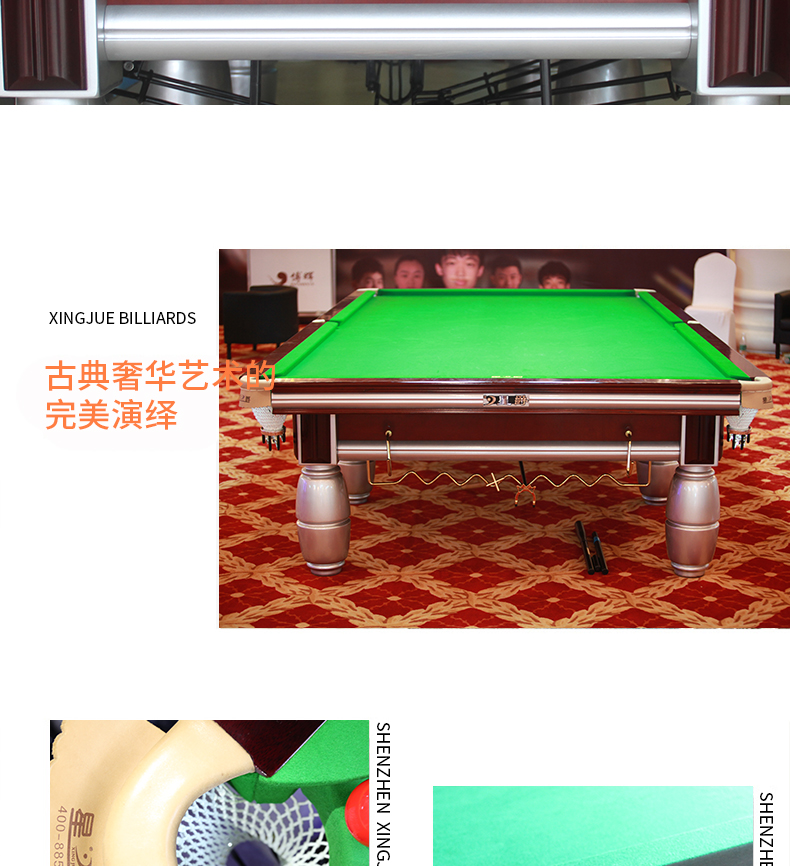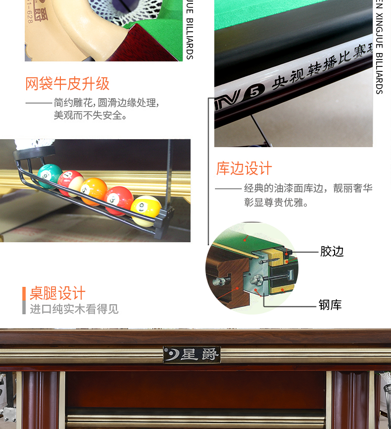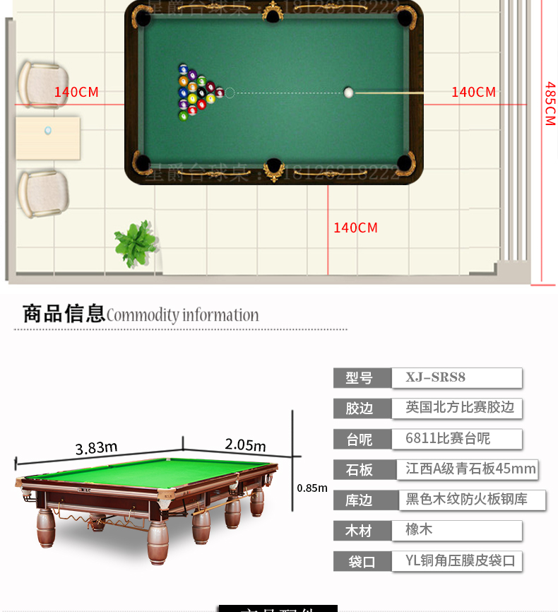 A級青石板,美國進(jìn)口防火板,實木扶手。尺寸:2.03*3.83*0.85米,配置:臺尼一張,英式球1盒,球桿4支,架桿4支,長打長架,巧粉12粒,手套2個,皮頭10粒,膠水1粒,桿架1個,三角框1個