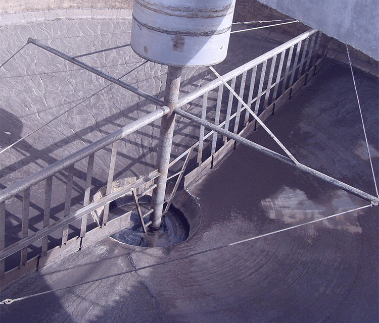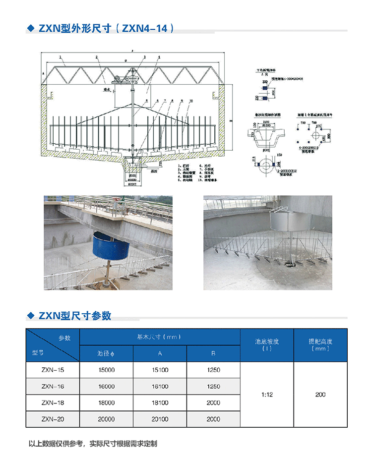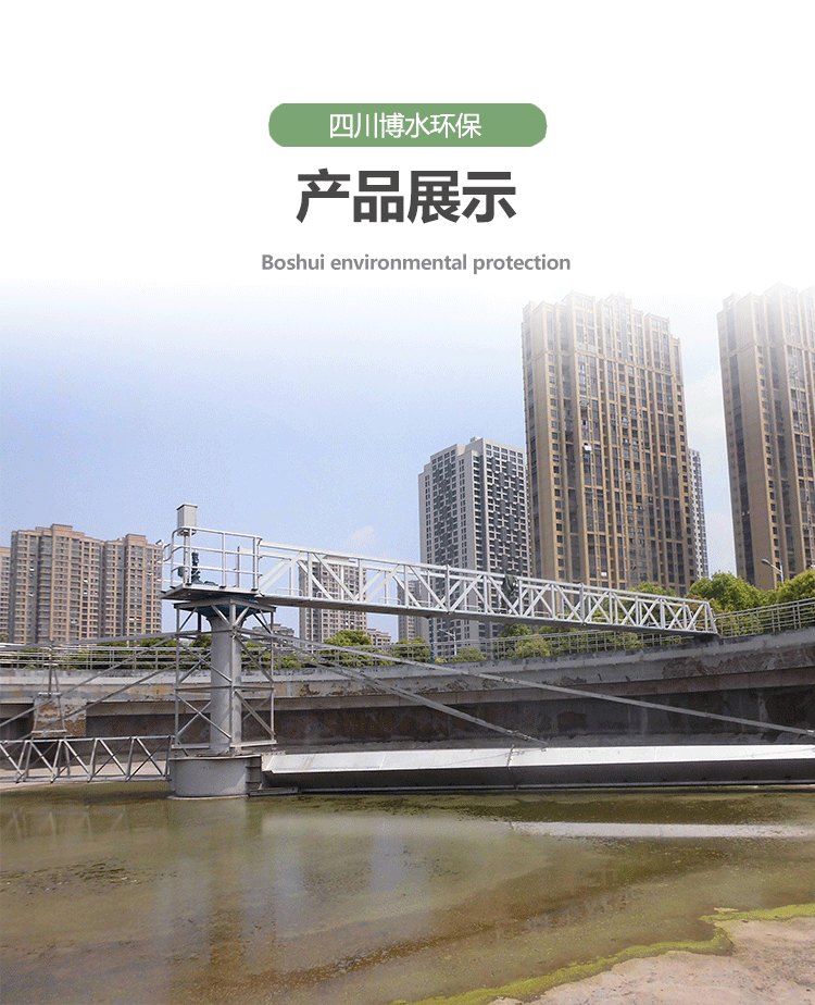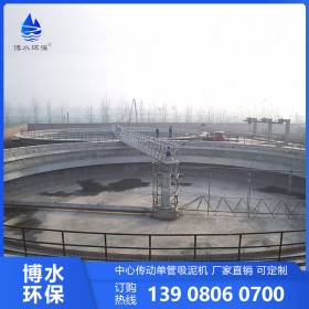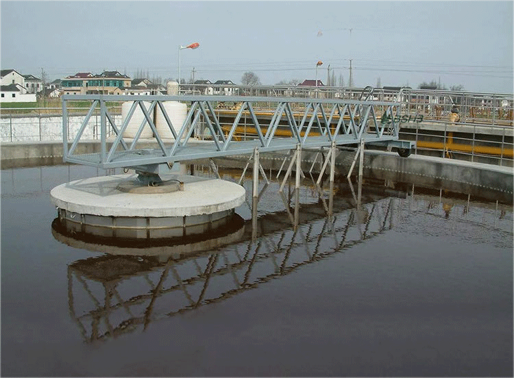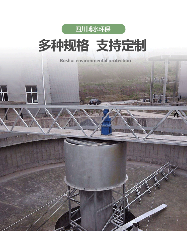 該設(shè)備采用中心傳動、垂架式,污水進(jìn)入周邊配水槽內(nèi),經(jīng)槽底配水孔均勻流入池內(nèi),并在周邊擋水裙板的作用下,水流從池底流向中心,污泥依靠自重沉積于池底,從而形成泥水分離,驅(qū)動裝置驅(qū)動中心豎架旋轉(zhuǎn),并帶動刮臂及吸泥管旋轉(zhuǎn),在靜水壓力的作用下,污泥均勻地進(jìn)入吸管上布置的吸口,然后通過中心排泥井的套筒閥排除池外,排泥量的大小可由套筒閥的升降來控制,水面的浮渣通過撇渣裝置撇向池邊,再由刮渣耙刮進(jìn)排渣斗內(nèi)排出池外。