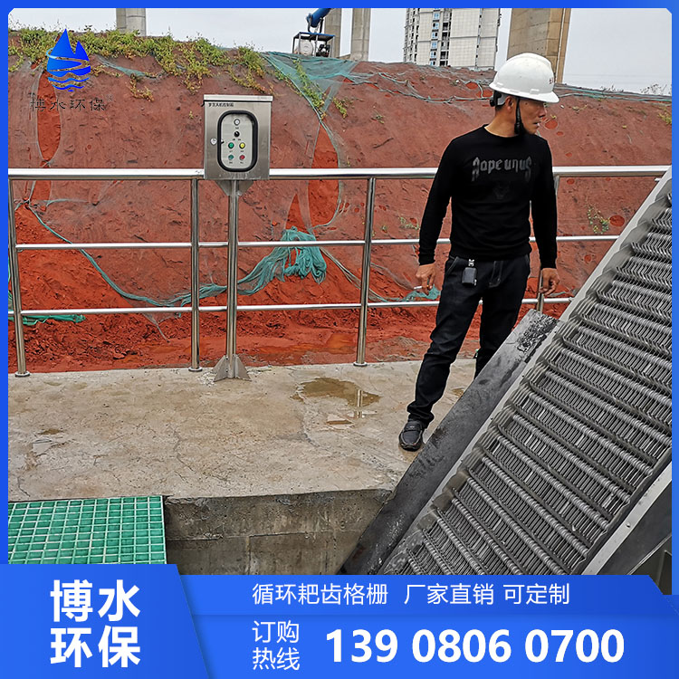 該機(jī)有珊齒、珊齒軸、鏈板等組成珊網(wǎng),以替代傳統(tǒng)格柵的柵條,珊網(wǎng)在機(jī)架內(nèi)做回轉(zhuǎn)運(yùn)動(dòng),從而將污水中的懸浮物攔截并不斷分離水中的懸浮物,因而工作效率高、運(yùn)行平穩(wěn)、格柵前后水位差小,并且不易堵塞。該機(jī)受用于做粗格柵使用。珊網(wǎng)中的珊齒可用工程塑料或不銹鋼兩種材料制造,珊齒軸和鏈板等由不銹鋼制造,大大提高了格柵整體的耐腐蝕性能。較小珊隙的格柵一般用于不銹鋼珊齒。設(shè)備運(yùn)行使耙齒把截留在珊面上的雜物自下而上帶至出渣口,當(dāng)耙齒自上向下轉(zhuǎn)向運(yùn)動(dòng)時(shí),雜物依靠重力自行脫落,從卸料口中落入輸送機(jī)或垃圾小車內(nèi),然后外運(yùn)或做進(jìn)一步處理。