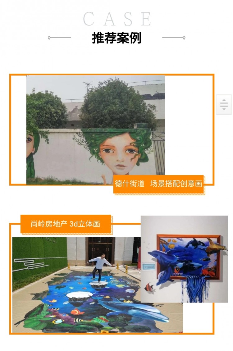 4:3D立體涂鴉畫:路演、展會、新品發(fā)布會活動現(xiàn)場墻繪、游樂場壁畫、公園美化墻繪、購物中心墻繪、商業(yè)街步行街墻體彩繪、房產售樓處墻繪、商品大賣場等街頭3D立體涂鴉