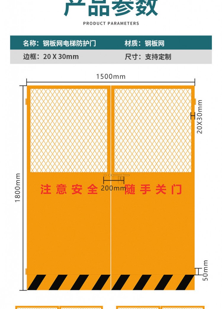 產(chǎn)品參數(shù) 產(chǎn)品名稱:四川廠家電梯井口防護(hù)門工地施工電梯安全門帶框套裝大板電梯門網(wǎng)片防護(hù)欄