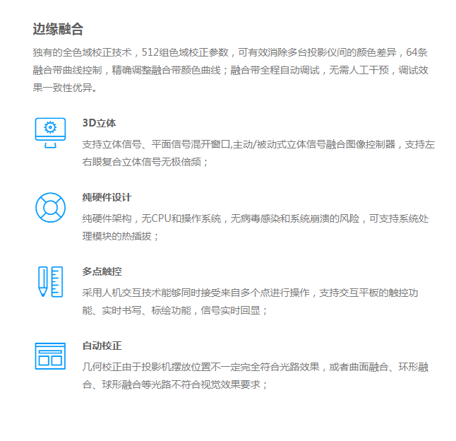 伯奧克系列融合控制器是伯奧克自主研發(fā)生產(chǎn),將多組投影機(jī)投射出的畫面進(jìn)行邊緣重疊,并通過融合技術(shù)顯示出一個(gè)沒有縫隙更加明亮,超大,高分辨率的整幅畫面,畫面的效果就象是一臺(tái)投影機(jī)投射的畫面的投影機(jī)融合處理系統(tǒng)。采用分布式設(shè)計(jì)理念,將信號(hào)接入、畫面拼接、融合帶處理等相關(guān)功能從系統(tǒng)上區(qū)分開,使得不同的功能在各自獨(dú)立的硬件中處理實(shí)現(xiàn),極大程度提升了設(shè)備的穩(wěn)定性。內(nèi)置多畫面拼接處理器和融合生成兩大功能,簡(jiǎn)化無縫投影顯示系統(tǒng)的構(gòu)架,信號(hào)源、融合器、投影機(jī)三點(diǎn)一線的結(jié)構(gòu)即可完成無縫投影顯示系統(tǒng)。