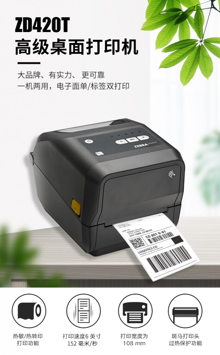 ZEBRA斑馬ZD420T二維碼不干膠標(biāo)簽快遞電子面單熱敏熱轉(zhuǎn)印打印機(jī)