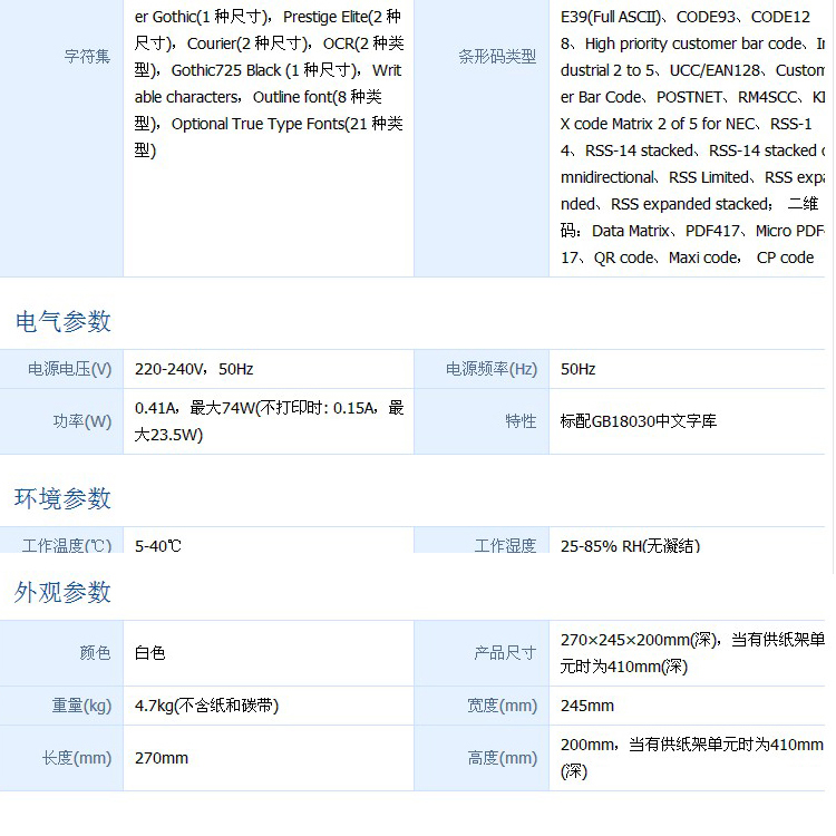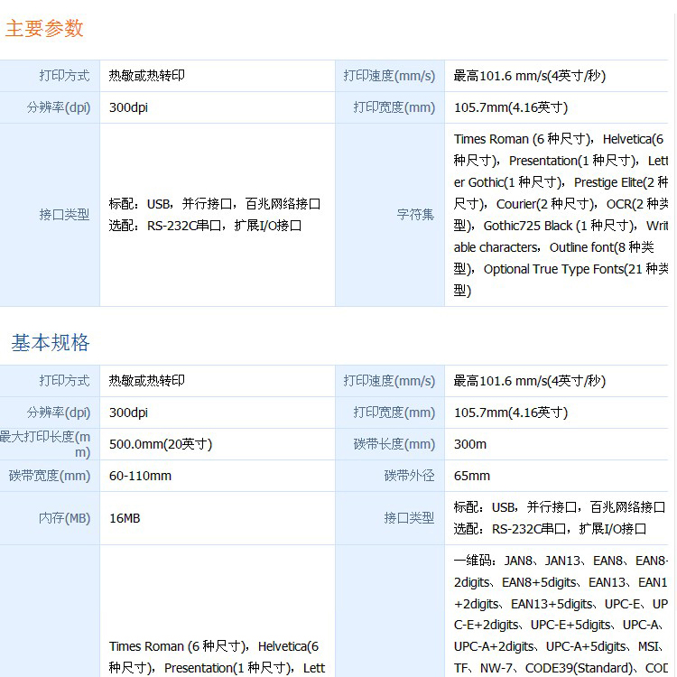 打印寬度(mm):105.7mm(4.16英寸),碳帶長(zhǎng)度(mm):300m,碳帶外徑:65mm,接口類型:標(biāo)配: USB, 并徹接口,百兆網(wǎng)絡(luò)接口,選配: RS-232c串口,擴(kuò)展1/O接口