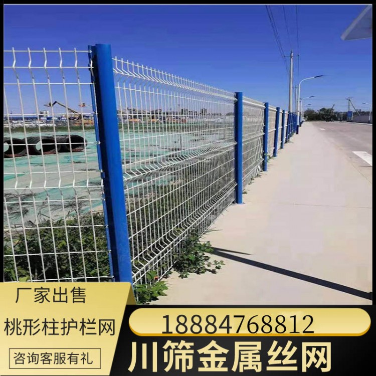 對于桃型柱護欄網(wǎng),其支撐立柱一般采用鋼或鋼塑立柱。出于造價方面的考慮,一般情況下鋼板網(wǎng)和金屬網(wǎng)僅僅在互通立交、停車區(qū)服務(wù)區(qū)等具有比較重要的設(shè)施和對景觀有較高要求的地區(qū)使用,對于一般路段仍宜采用桃型柱護欄網(wǎng)。