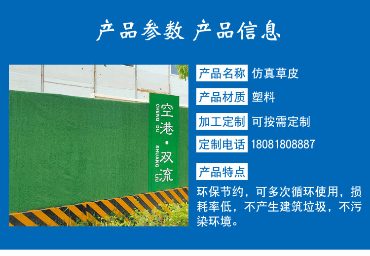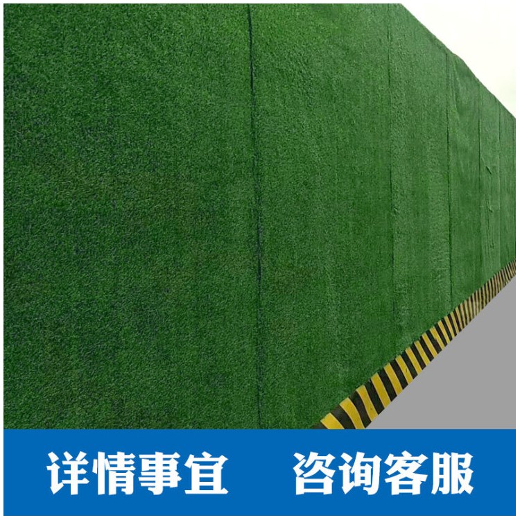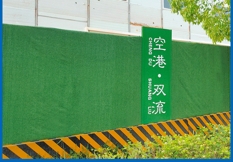 綠色人造草坪來覆蓋。人造草坪的品質要比噴繪的好,因為厚度的緣故,通常用人造草坪做出的圍擋立體效果好。而且人造草坪的圍擋要耐用5-6年一點問題沒有。常見的模式是用人造草坪打底,再在草坪上面黏貼上自提或通過后背的面板做造型都是可以的。