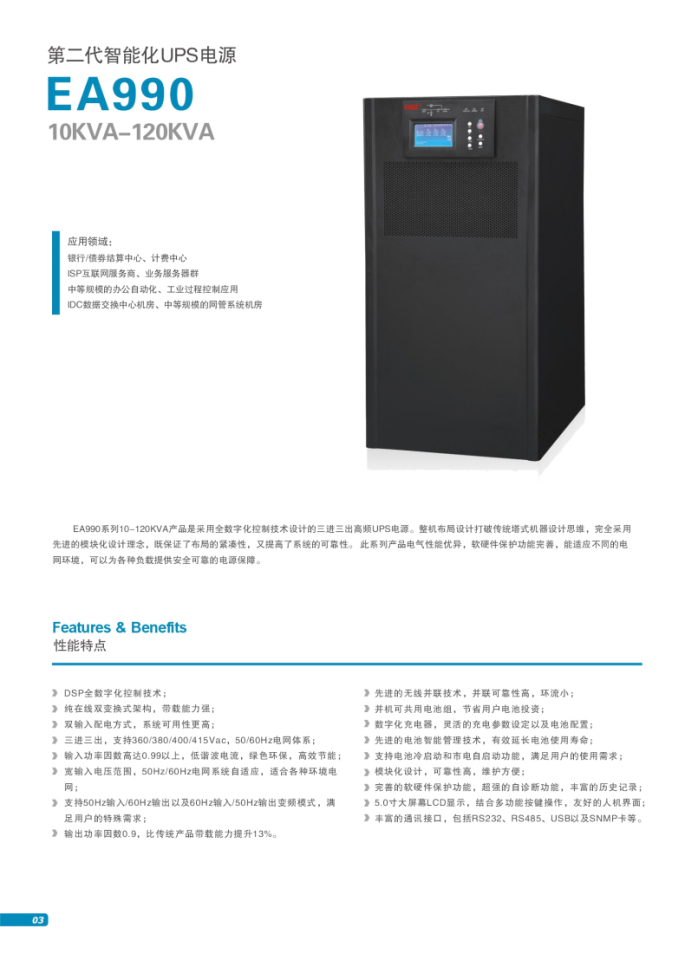 易事特代EA900系列1KVA~10KVA UPS是易事特公司集新研發(fā)成果和應(yīng)用驚訝,設(shè)計(jì)、制造的新一代通用型UPS電源,采用的DSP數(shù)字化控制技術(shù),有效提升了產(chǎn)品性能和系統(tǒng)可靠性, 并實(shí)現(xiàn)更高功率密度的集成和小型化。同時(shí)為了滿(mǎn)足用戶(hù)的個(gè)性化需求,而針對(duì)國(guó)內(nèi)外中小企事業(yè)單位以及小型供電環(huán)境需求而推出的小功率在線(xiàn)式 UPS電源產(chǎn)品,可為用戶(hù)的部門(mén)級(jí)服務(wù)器、小型局域網(wǎng)、工作站、工控機(jī)、小型設(shè)備,及其他小型電子儀器提供高可靠電源保護(hù)。防備用電源
