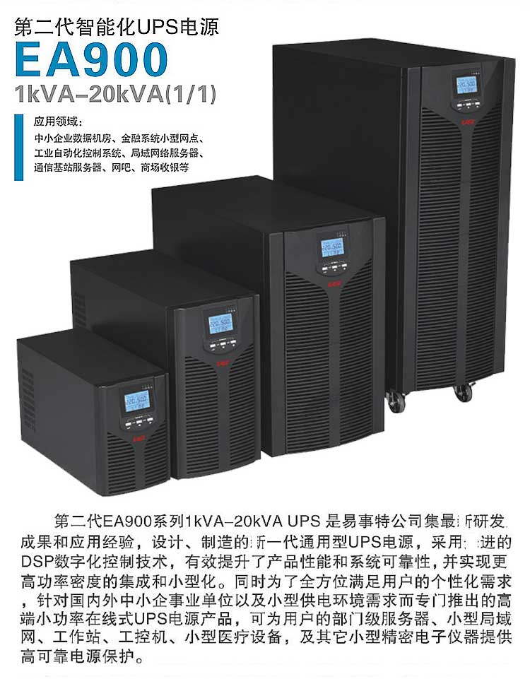 新一代 UPS是易事特公司集新研發(fā)成果和應(yīng)用驚訝,設(shè)計(jì)、制造的新一代通用型UPS電源,采用的DSP數(shù)字化控制技術(shù),有效提升了產(chǎn)品性能和系統(tǒng)可靠性, 并實(shí)現(xiàn)更高功率密度的集成和小型化。同時(shí)為了滿足用戶的個(gè)性化需求,而針對(duì)國(guó)內(nèi)外中小企事業(yè)單位以及小型供電環(huán)境需求而推出的小功率在線式 UPS電源產(chǎn)品,可為用戶的部門級(jí)服務(wù)器、小型局域網(wǎng)、工作站、工控機(jī)、小型設(shè)備,及其他小型電子儀器提供高可靠電源保護(hù)。防備用電源