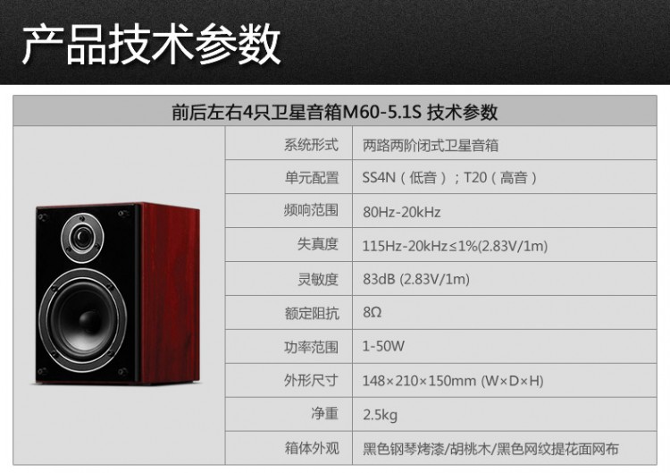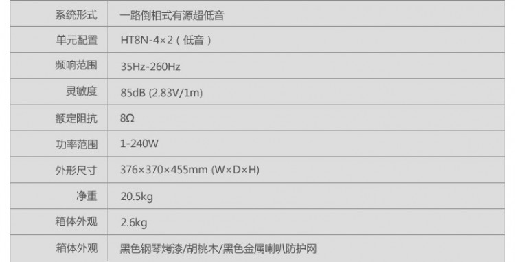 | 凈重(each) | 2.5kg | 箱體外觀 | 黑色鋼琴烤漆/豪華胡桃木/黑色金屬喇叭防護(hù)網(wǎng) | |