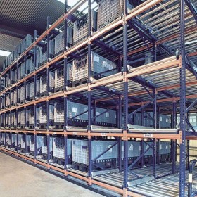 重力式貨架又叫自重力貨架,屬于重型倉庫貨架,是由托盤式貨架演變而來的,只是在橫梁上安上滾筒式軌道,軌道呈3-5度傾斜。托盤貨物用叉車搬運至貨架進貨口,利用自重,托盤從進口自動滑行至另一端口的取貨口。適用于少品種大批量同類貨物的存儲,空間利用率極高,重力式貨架深度及層數(shù)可按需要而定。
