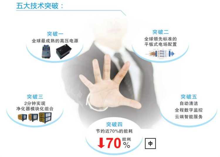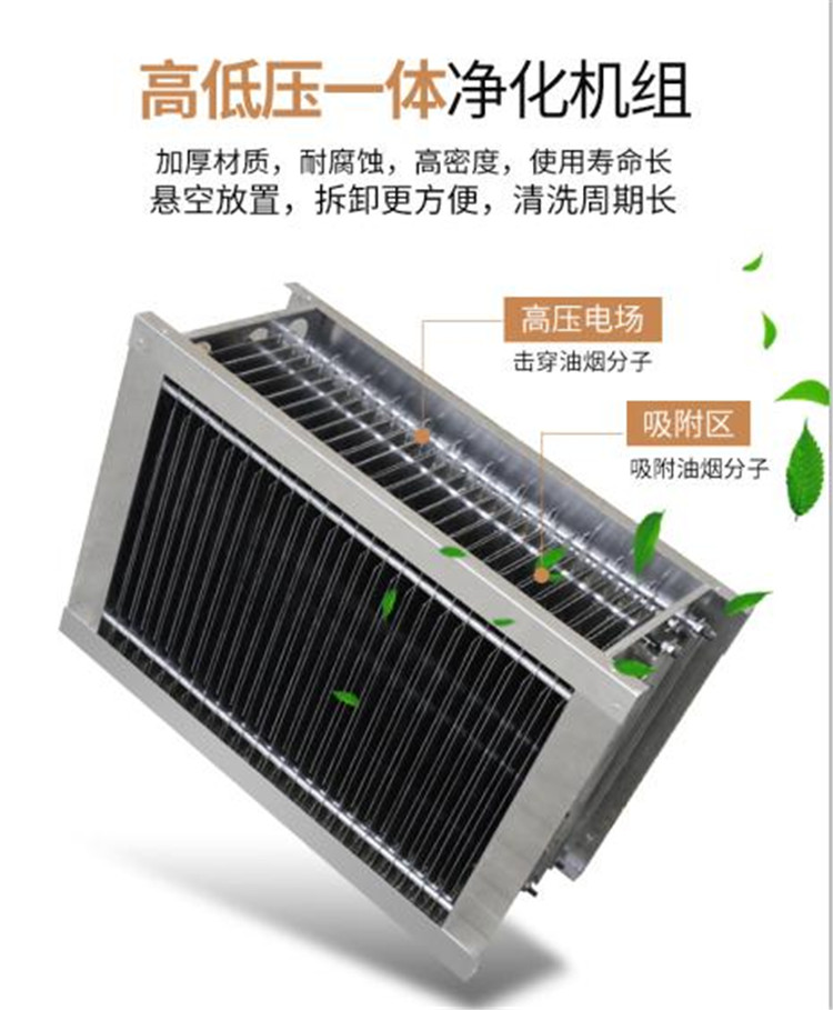 四級(jí)凈化:電子靜電凈煙原理,不銹鋼電離器,使氣體離子化,強(qiáng)電場(chǎng)使顆粒物帶電,成為帶電顆粒。鋁合金集成器,帶電顆粒到達(dá)第二段集成器后使粒子撞擊至收集電板而立即被收集電極吸附,90%以上的污染物被濾除。能有效收集大于0.1微米的顆粒。