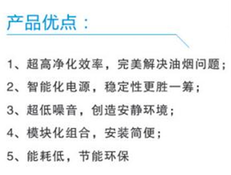 環(huán)保:設(shè)備運(yùn)行時(shí)不要任何輔助凈化添加劑,油煙凈化率高達(dá)95%以上,凈化后可以實(shí)現(xiàn)低空排放。
