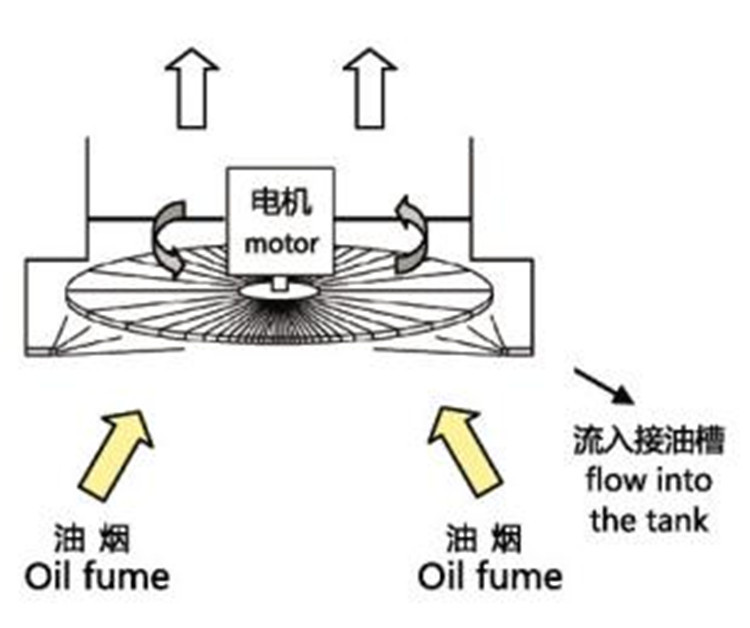 動(dòng)態(tài)屏蔽原理,再次處理大顆粒油粒。屏蔽器上自身有間隙,在高速旋轉(zhuǎn)下,油煙顆粒因?yàn)榫W(wǎng)盤后面外界風(fēng)機(jī)產(chǎn)生的負(fù)壓油煙會(huì)通過間隙,當(dāng)通過間隙的時(shí)候,由于網(wǎng)盤的速度很快,大的顆粒來不及通過就被屏蔽器離心力攔截并回收。
