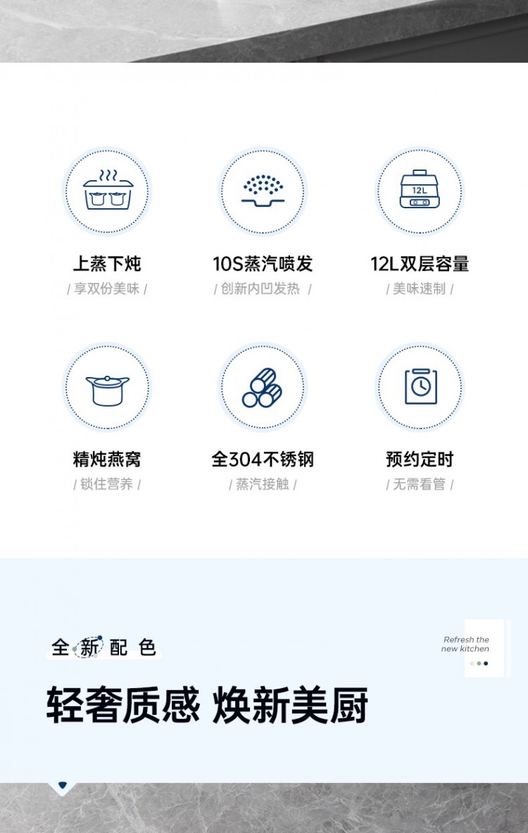 2.12預(yù)約定時。全自動免看火,逃離廚房桑拿天。 3.飽滿蒸汽。創(chuàng)新內(nèi)凹式蒸鍋設(shè)計,飽滿蒸汽40g/min,鎖住更多營養(yǎng)。 4.小巧能容。A4大小,特大肚容,再多海鮮一鍋端。 5.蒸汽燉補。蒸汽加熱更均勻,湯水更出味,養(yǎng)分不流失。 6.呵護(hù)周全。防干燒、防過熱雙重安全保護(hù)。 7.蒸煮時間。蝦400g約5min、魚500g約6min、排骨400g約7min、燕窩5g約25min。 ![]() ![]() ![]() ![]() ![]() ![]() ![]() ![]() ![]() ![]() ![]() ![]() ![]() ![]() ![]() ![]() ![]() ![]() ![]() ![]() ![]() ![]() ![]() ![]() ![]() 共0條 相關(guān)評論 |