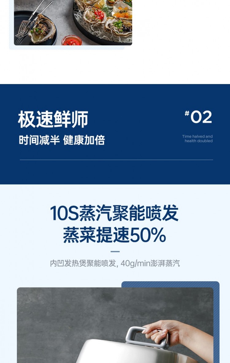 3.飽滿蒸汽。創(chuàng)新內(nèi)凹式蒸鍋設(shè)計,飽滿蒸汽40g/min,鎖住更多營養(yǎng)。