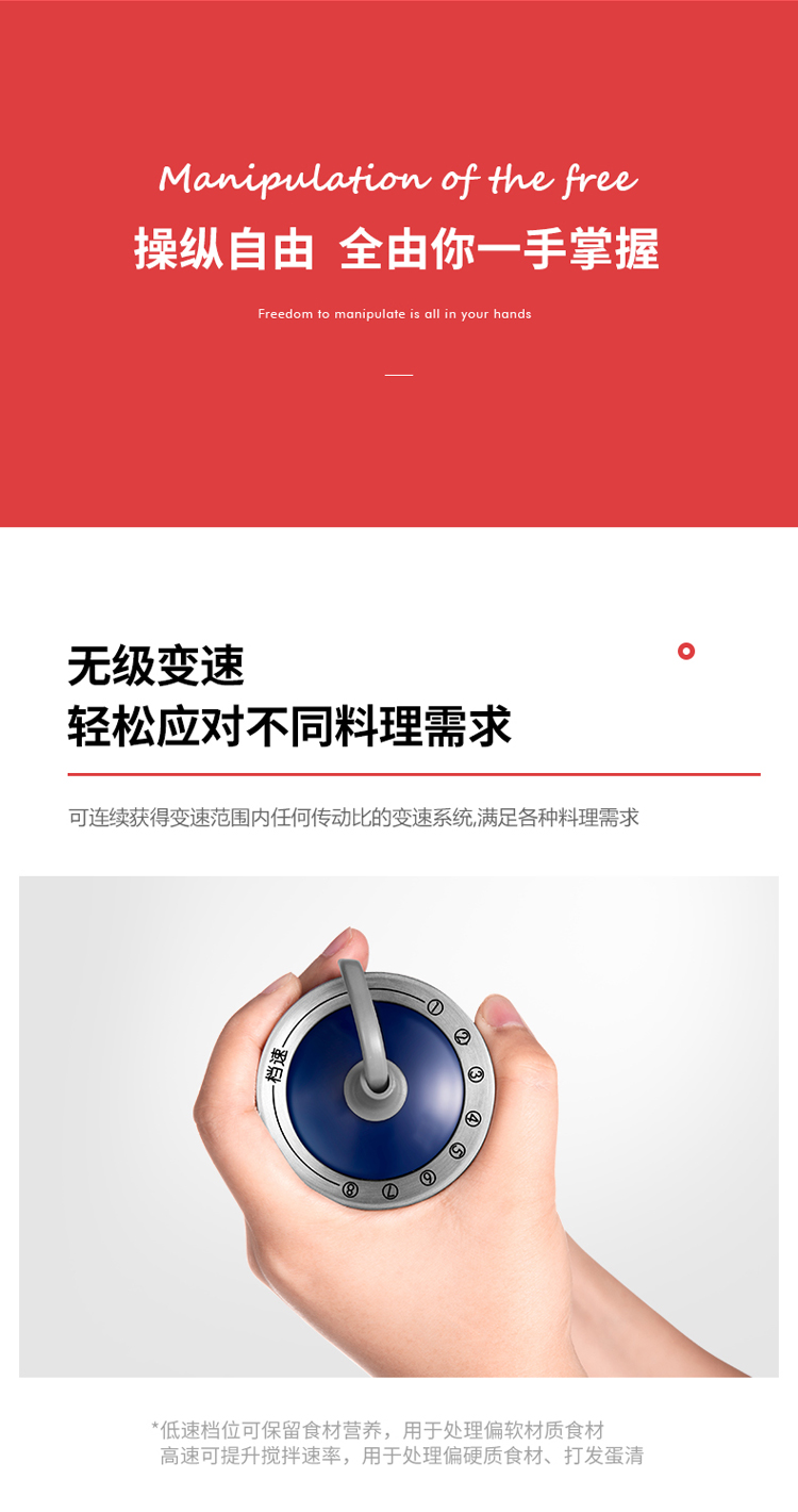 3.八檔調(diào)速。軟硬食材都能兼顧,旋鈕調(diào)速選擇檔位。