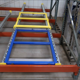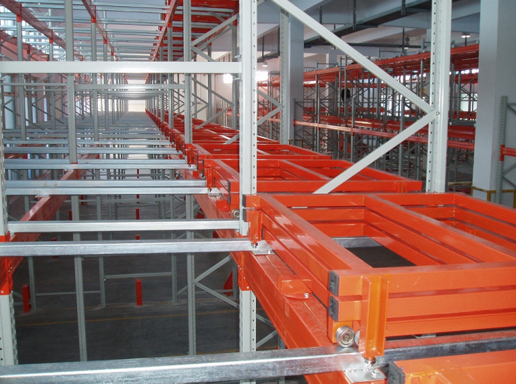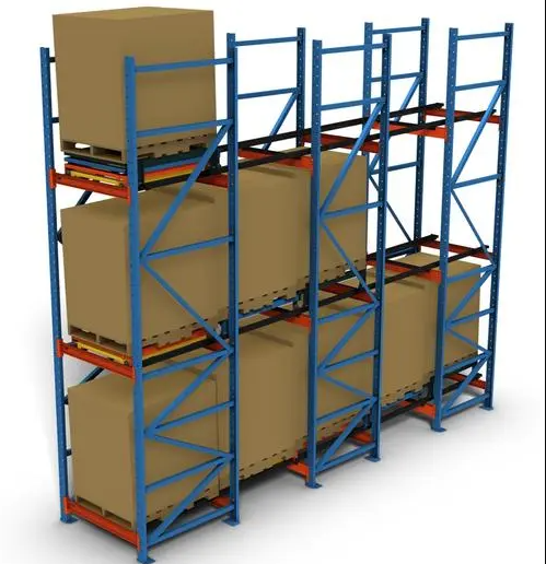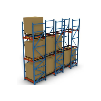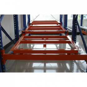 后推式貨架又名壓入式貨架——是在前后梁間以多層臺(tái)車重疊相接,從外側(cè)將疊棧貨物置于臺(tái)車推入,后儲(chǔ)存之貨品會(huì)將原先貨品推往里面。