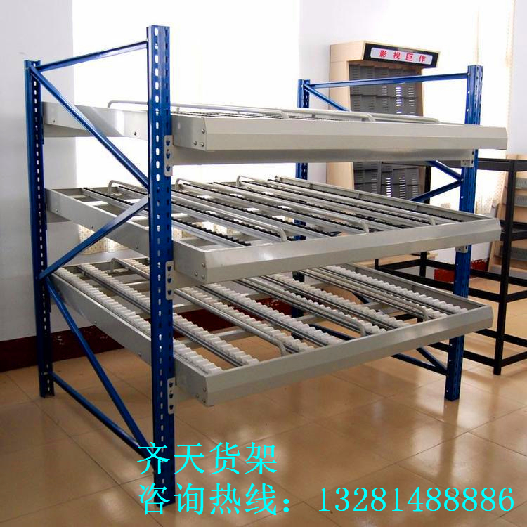 1.流利式貨架采用輥輪鋁合金,鈑金等流利條,利用貨物臺(tái)架的自重,從一邊通道存貨,另一邊通道取貨實(shí)現(xiàn)先進(jìn)先出,存儲(chǔ)方便,以及一次補(bǔ)貨多次取貨。