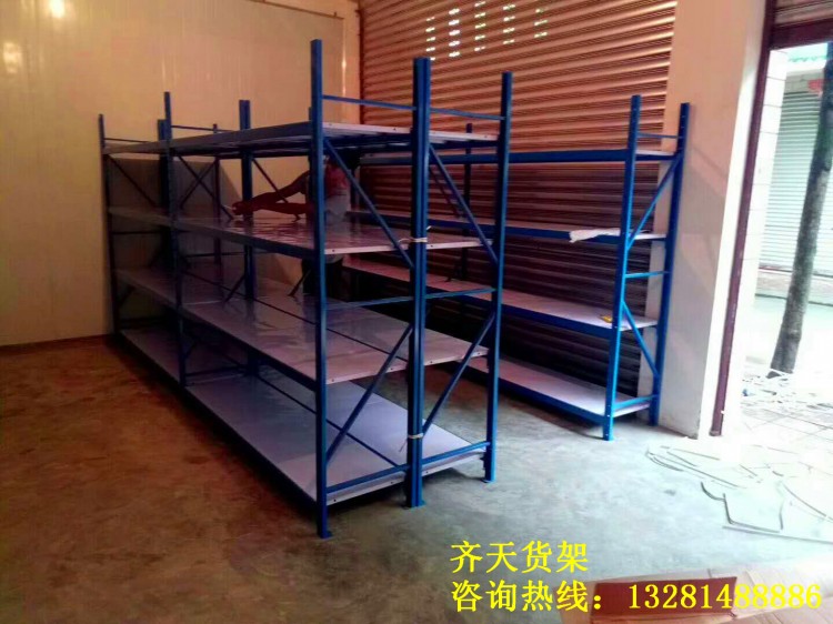 4、橫梁扣件與立柱片孔組裝,然后鋪設(shè)鋼層板,至此組裝成-組完整的中型貨架。