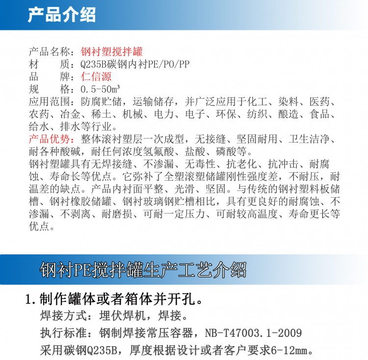 產(chǎn)品參數(shù) 產(chǎn)品名稱:【仁信源】鋼襯塑攪拌罐 內(nèi)外防腐反應(yīng)釜 一體成型防滲漏