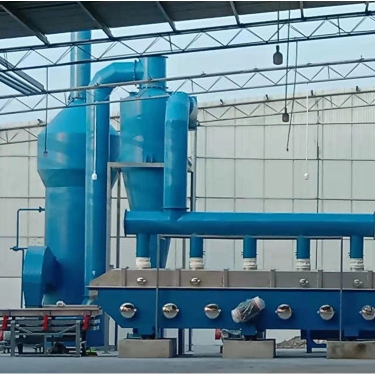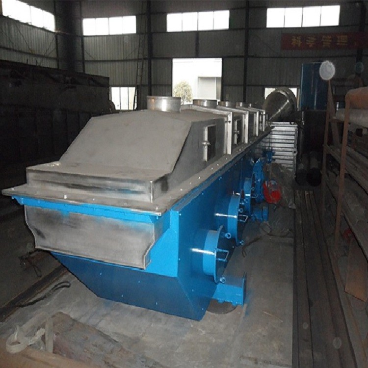 物料自進料進口進入機內(nèi),在振動力作用下,物料沿水平面流化床拋擲,向前連續(xù)運動,熱風向上穿過流化床同濕物料換熱后,濕空氣經(jīng)旋風分離器除塵后由排風排出.干燥物料由排料進口排出。