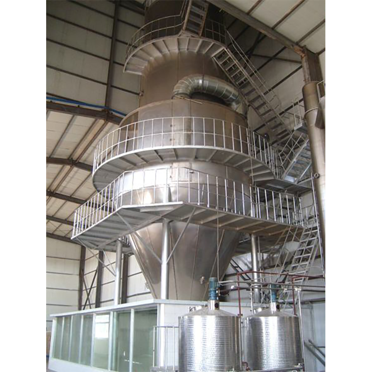 料液經(jīng)高壓泵泵送至壓力噴嘴,被霧化成微細(xì)的霧滴。經(jīng)熱源加熱的熱空氣,通過(guò)分風(fēng)器合理布風(fēng)后,進(jìn)入干燥塔。霧滴與熱空氣在干燥塔內(nèi)充分混合,迅速進(jìn)行熱質(zhì)交換,在極短的時(shí)間內(nèi)被干燥成為粉粒狀產(chǎn)品,粒徑較大的產(chǎn)品從干燥塔底部排出,粒徑較小的產(chǎn)品隨熱空氣進(jìn)入旋風(fēng)除塵器,分離下的產(chǎn)品經(jīng)卸料閥排出,含少量粉塵的尾氣經(jīng)水除塵器除塵后排空。根據(jù)霧化壓力不同可分為高壓、中壓和低壓噴霧干燥機(jī),根據(jù)流場(chǎng)的不同可分為并流、混流和逆流噴霧干燥機(jī)。