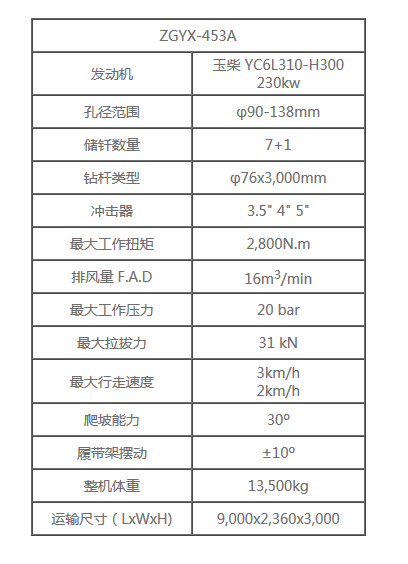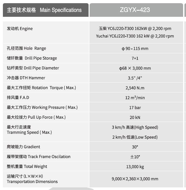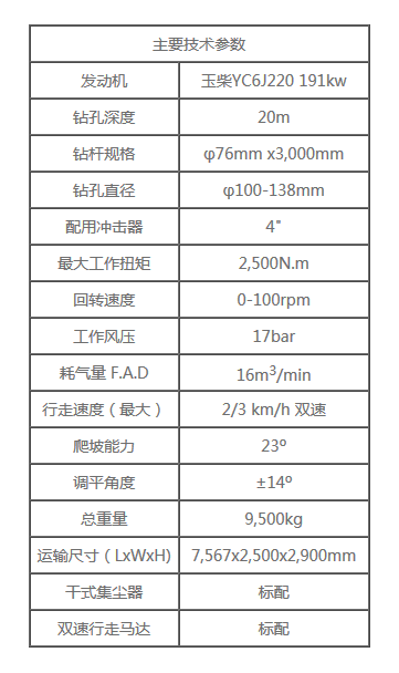 1. matching power of the rig is jade wood YC6J190, with 12/14.5 screw air compressor. satisfying the aperture mm 80-115, standard dry dust collector;