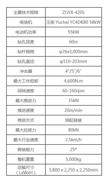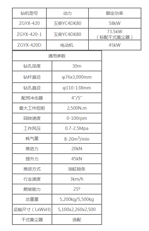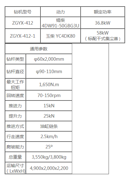 1. matching power of the rig is jade wood YC6J190, with 12/14.5 screw air compressor. satisfying the aperture mm 80-115, standard dry dust collector;