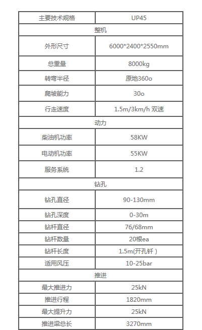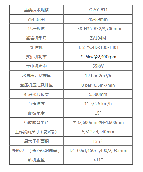 1. matching power of the rig is jade wood YC6J190, with 12/14.5 screw air compressor. satisfying the aperture mm 80-115, standard dry dust collector;