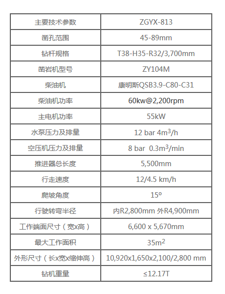 ZGYX-813 tunneling trolley, widely used in underground mine development, small tunnel excavation, but also used in anchor hole reinforcement works. Carefully designed ZGYX-813 from the appearance, configuration, system control and other aspects will provide customers with a better quality perforation experience. The chassis and lifting safety roof based on safety considerations ensure the passage and stability of the equipment, so that the operator can always work in a safe position; the "direct" positioning drilling arm system to achieve rapid and accurate drilling positioning; equipped with ZGYX-104 drilling machine power up to 20 kW, its 60 Hz frequency is a powerful guarantee for efficient drilling, double buffer mechanism shock absorption system, drilling automatic adaptation system to improve penetration efficiency while effectively reducing the consumption of drilling tools, improve production efficiency.