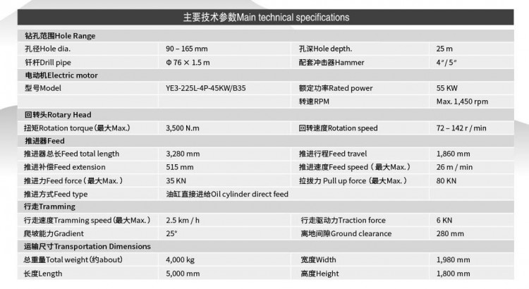 主要用途及試用范圍:適用于建筑施工、公路施工,以及其他的機(jī)械化工程。該鉆車使用接卸式鉆桿、鉆鑿垂直、傾斜、水平主打直徑為90-165毫米孔,鉆孔深度可達(dá)25米。