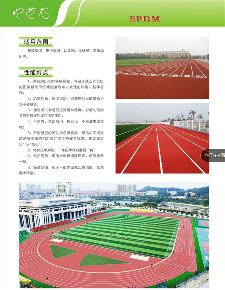 彩色EPDM彈性透氣型球場(chǎng)、運(yùn)動(dòng)地面彩色EPDM面層材料因其突出特性,現(xiàn)今日益為全世界體育場(chǎng)地所接受,EPDM性能卓越,除具有PU彈性球場(chǎng)所有特點(diǎn)外,更具以下優(yōu)點(diǎn):彈性適中:良好的彈性、優(yōu)異的減震性能對(duì)運(yùn)動(dòng)員的腿部關(guān)節(jié)能起到很好的保護(hù)作用。防滑性強(qiáng):鋪面有卓越的防滑性能,摩擦系數(shù)高??估匣?不受紫外線、臭氧、風(fēng)雨的影響而褪色、粉化,能長(zhǎng)期保持鮮艷色彩,壽命較長(zhǎng)。耐沖擊性:具有強(qiáng)韌的彈性層及緩沖層,可吸收強(qiáng)韌的沖擊。顏色多樣:五彩斑斕,可拼裝多種顏色的圖案。地基條件:基礎(chǔ)要求簡(jiǎn)單,即使較差的地基也可鋪裝,粘接性也較好。表面:不易起泡。滲水性能好:雨停后表面無(wú)水坑,且可投入使用。